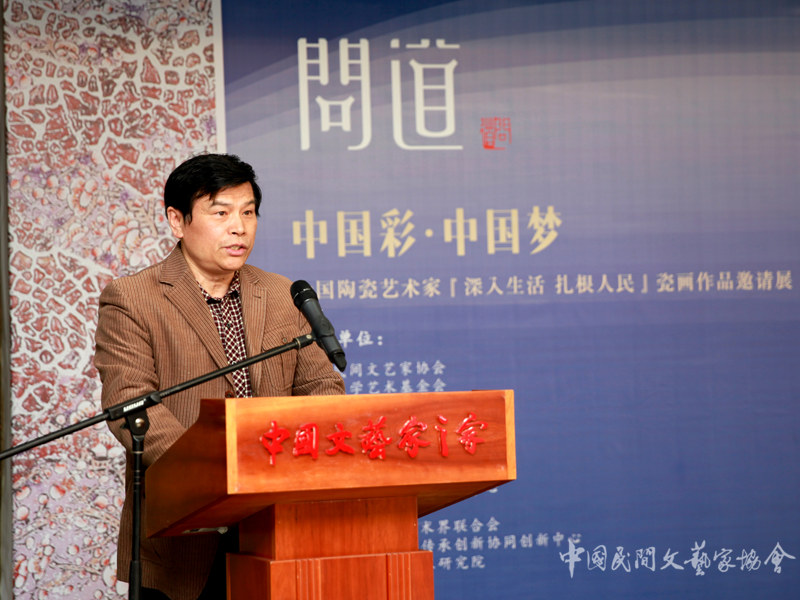 在全国文艺界深入学习贯彻党的十九大精神之际,由中国民协、中国文学艺术基金会、中共景德镇市委宣传部主办,中国文联民间文艺艺术中心、景德镇陶瓷大学、景德镇市文联、景德镇陶瓷文化传承创新协同创新中心、景德镇市瓷画艺术研究院承办的“中国彩•中国梦”全国陶瓷艺术家“深入生活、扎根人民”瓷画作品邀请展11月7日在北京中国文艺家之家展览馆开幕。中国文联党组成员、书记处书记陈建文出席并宣布展览开幕。中国民协副主席万建中、中共景德镇市委宣传部副部长郑鹏、江西省文联副主席余志华、景德镇市瓷画艺术研究院副院长李文跃分别在开幕式上致辞。开幕式由中国民协分党组成员、副秘书长周燕屏主持。