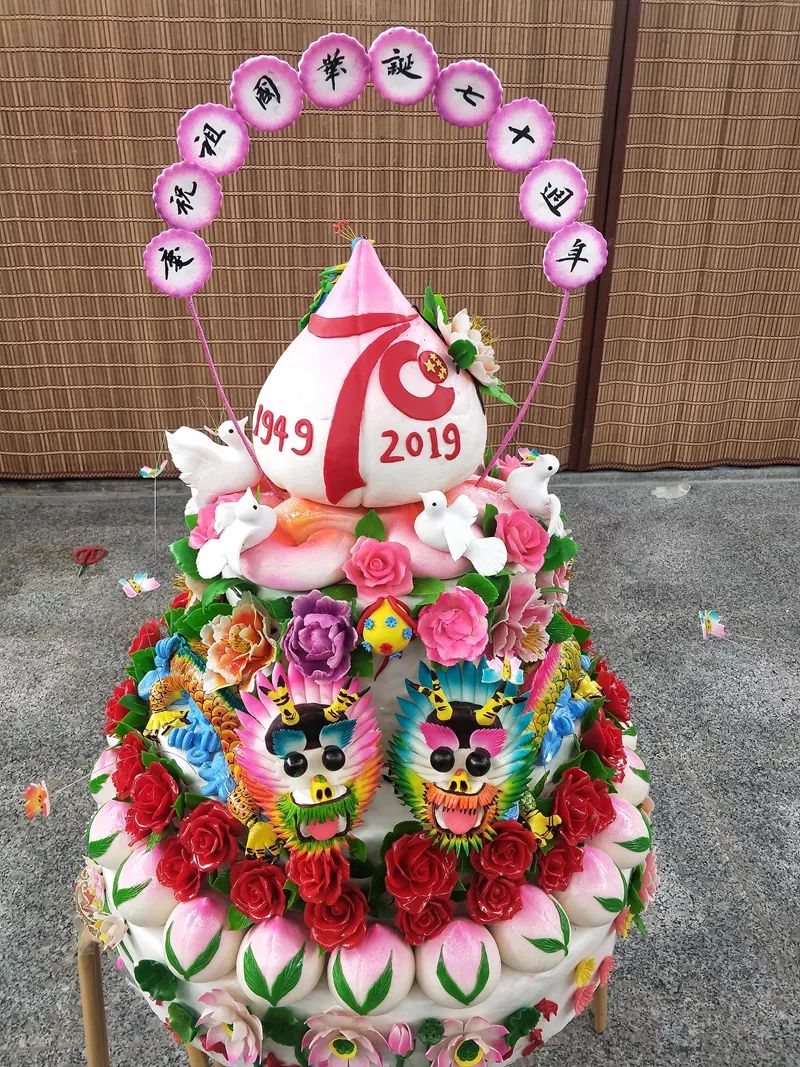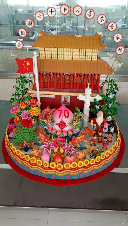 《锦绣中华》作品包含花鸟、花饽饽、和平鸽和国旗等,寓意祖国大好河山欣欣向荣,庆祝祖国70周年华诞,祝福祖国繁荣昌盛。