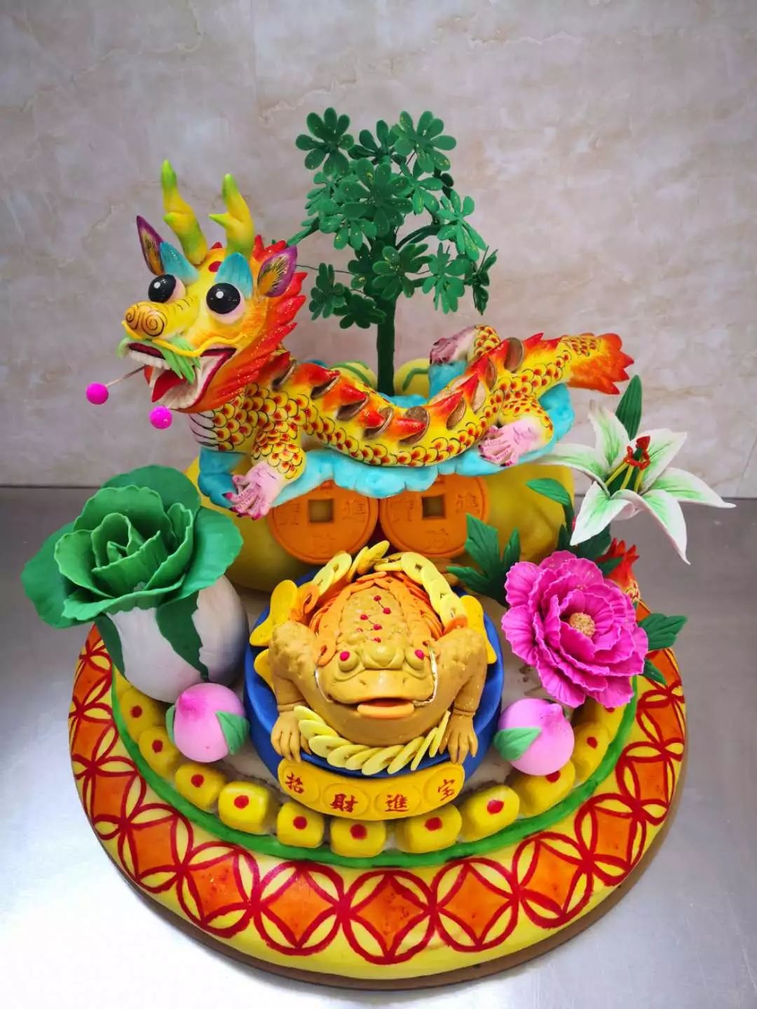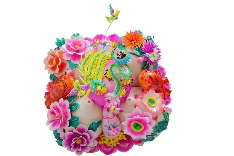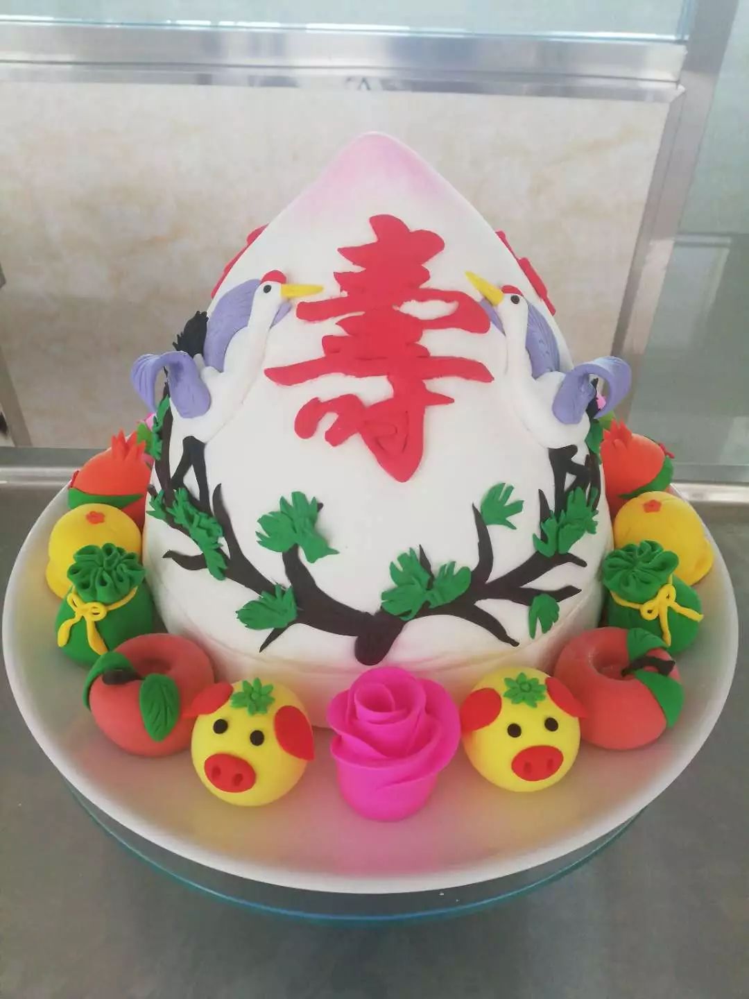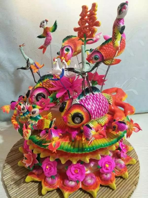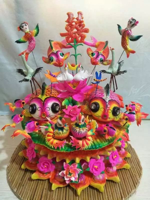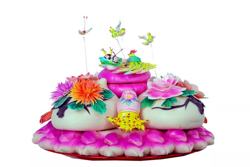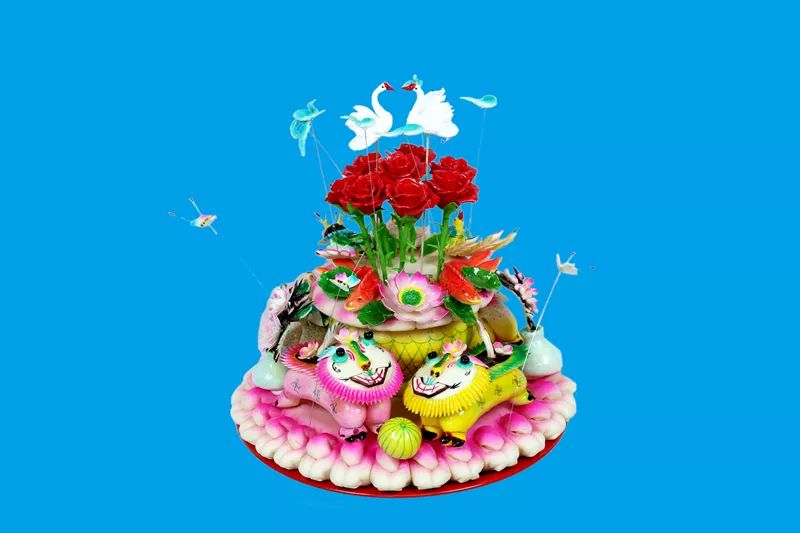 《金鱼鲤鱼穿荷花》作品里六条金鱼鲤鱼寓意六六大顺,天鹅比翼欲飞,元宝垒成堆,一对仙鹤空中舞,寓意新人一辈子幸福。该作品为传统新婚祈福用饽饽,深受胶东人民喜爱。
