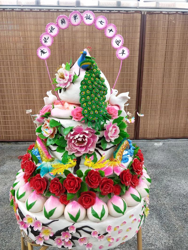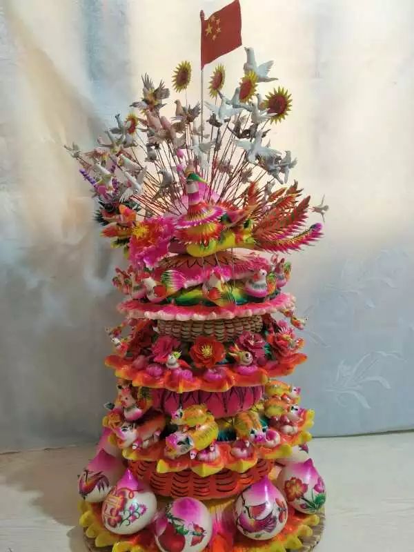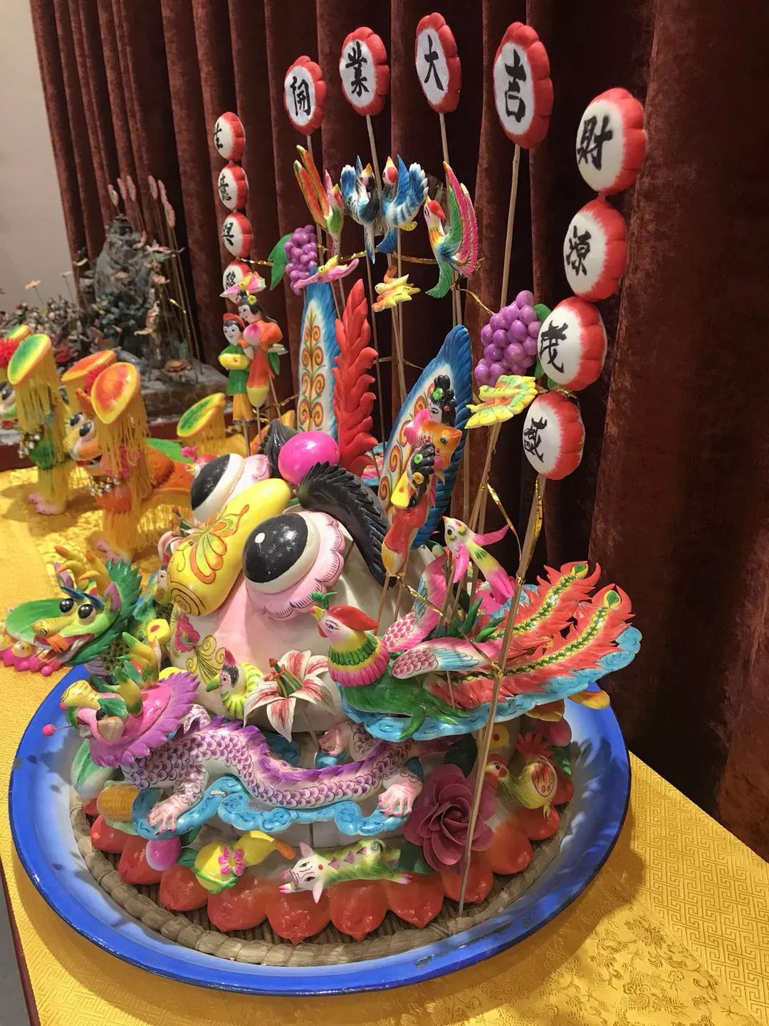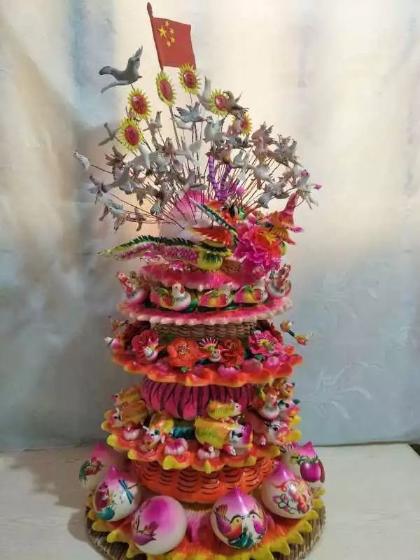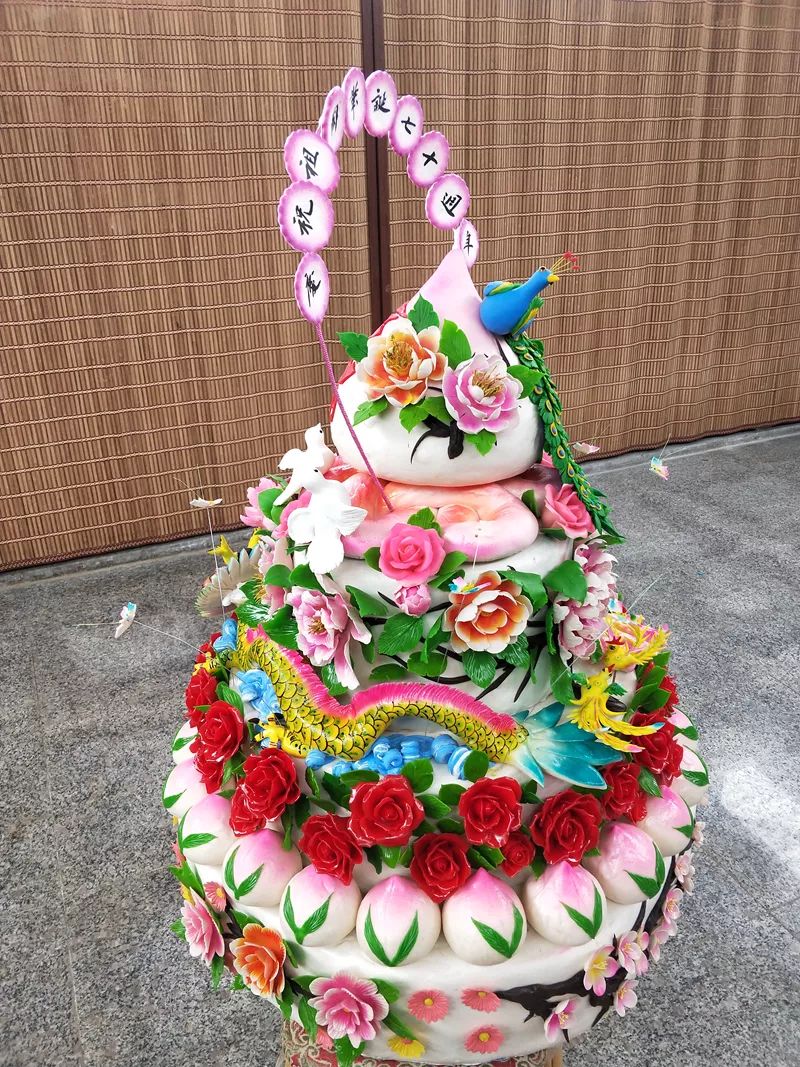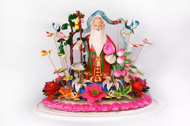 《金鱼鲤鱼穿荷花》作品里六条金鱼鲤鱼寓意六六大顺,天鹅比翼欲飞,元宝垒成堆,一对仙鹤空中舞,寓意新人一辈子幸福。该作品为传统新婚祈福用饽饽,深受胶东人民喜爱。